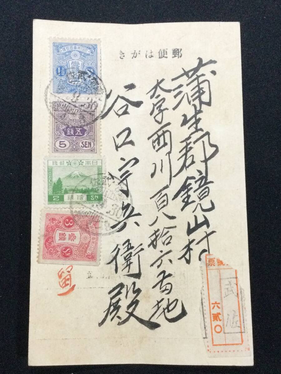 - 書留はがき 田沢1銭5厘・3銭・5銭風景2銭貼 櫛型 滋賀・武佐 6.9.30