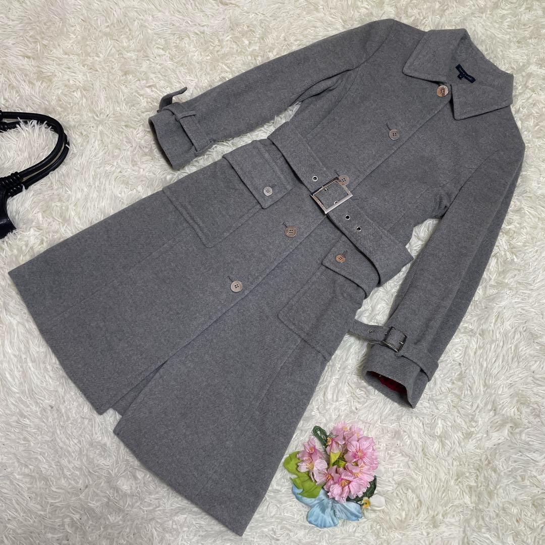 > 美品 TOMMY HILFIGER トミーヒルフィガー ロングコート グレー ロゴベルト アンゴラ ウール レディース Mサイズ