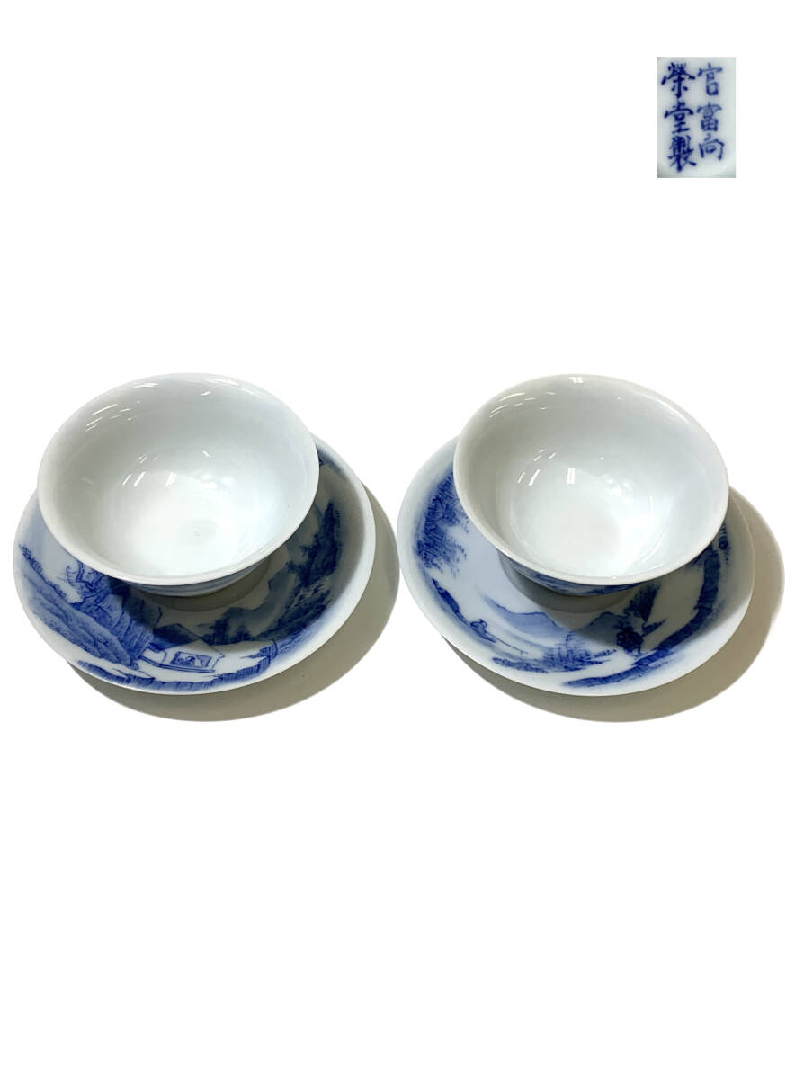 > K59★官富向栄堂製 青花山水人物図茶杯 茶托 染付 中国古玩 アンティーク 現状品