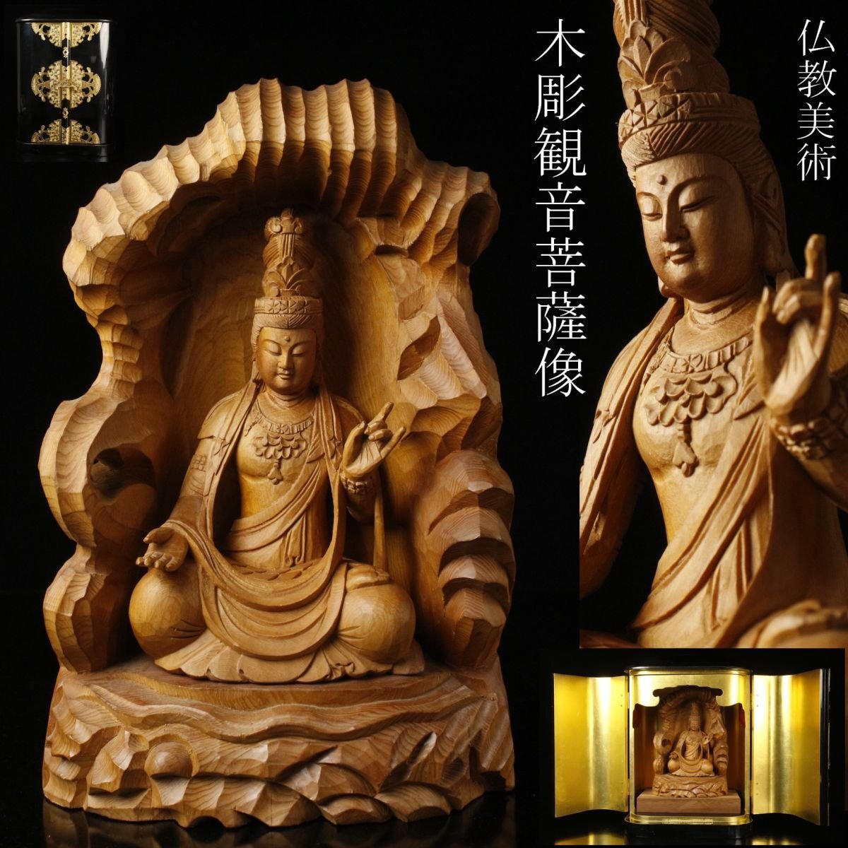 【LIG】仏教美術 木彫 観音菩薩坐像 30㎝ 黒塗厨子 彫金金具装飾 寺院収蔵品 [.QI]25.7拍卖