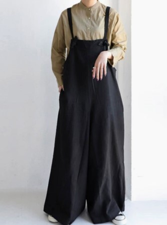 - 黒のコットン風素材シンプルオーバーオール★新品★フリーサイズ★肩紐調節可能なシンプルワイドパンツ