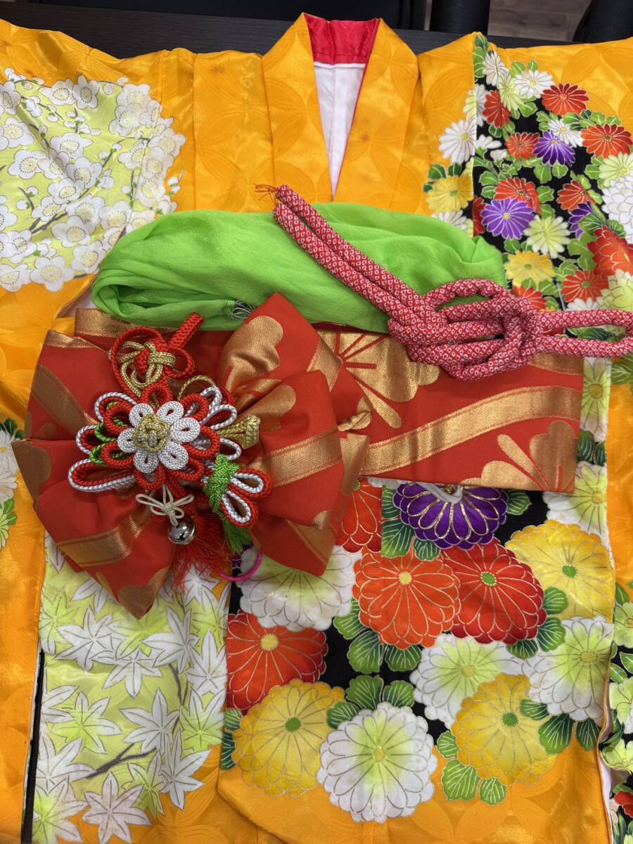 - 【七五三 7歳 女の子】着物セット 作り帯 志古貴 帯締め付き 菊柄 オレンジ 黄色系 和装 レトロ 汚れあり