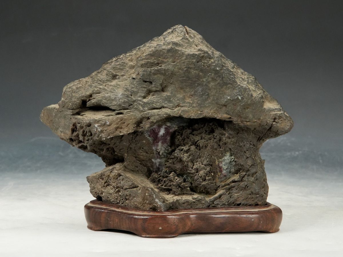 - 【ISBS】加茂川石(台座付) 「茅舎石」紅流し 添景 添配 水石 盆石 鑑賞石 横幅約18.0㎝×奥行約8.6㎝×高さ約15.5㎝[Y2025112804]