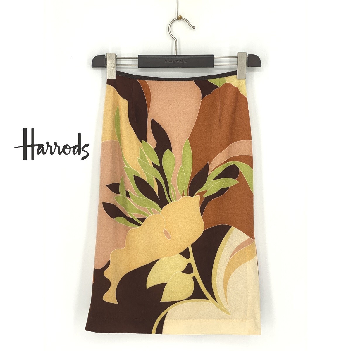 > B0716/極美品 Harrods ハロッズ トリアセテート ベロア ベルベット 光沢 総柄 タイト ミモレ丈 膝丈 スカート S程 マルチカラー レディース