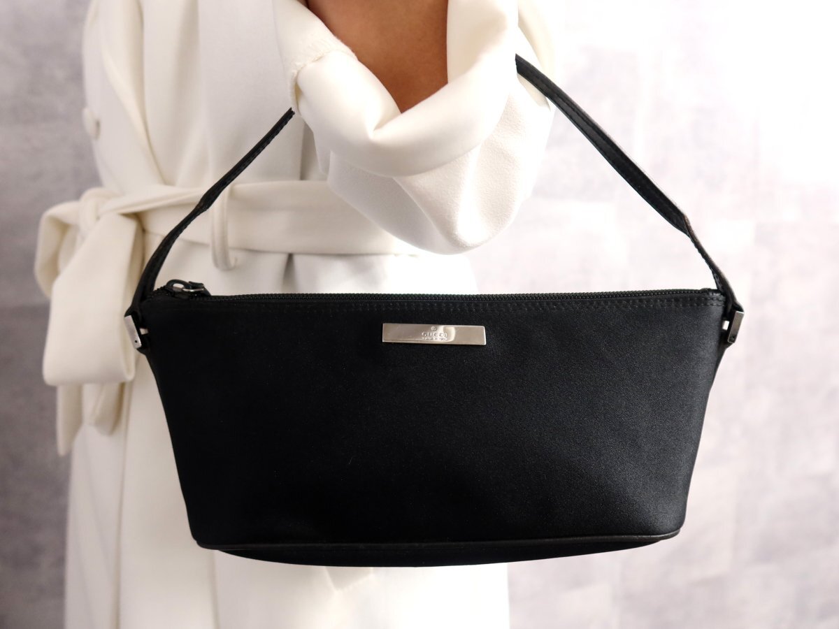 > ●超美品●GUCCI グッチ●ロゴプレート●ワンハンドル●ナイロン カーフ レザー 本革●ポーチ●黒●シルバー金具●イタリア製●Js61946