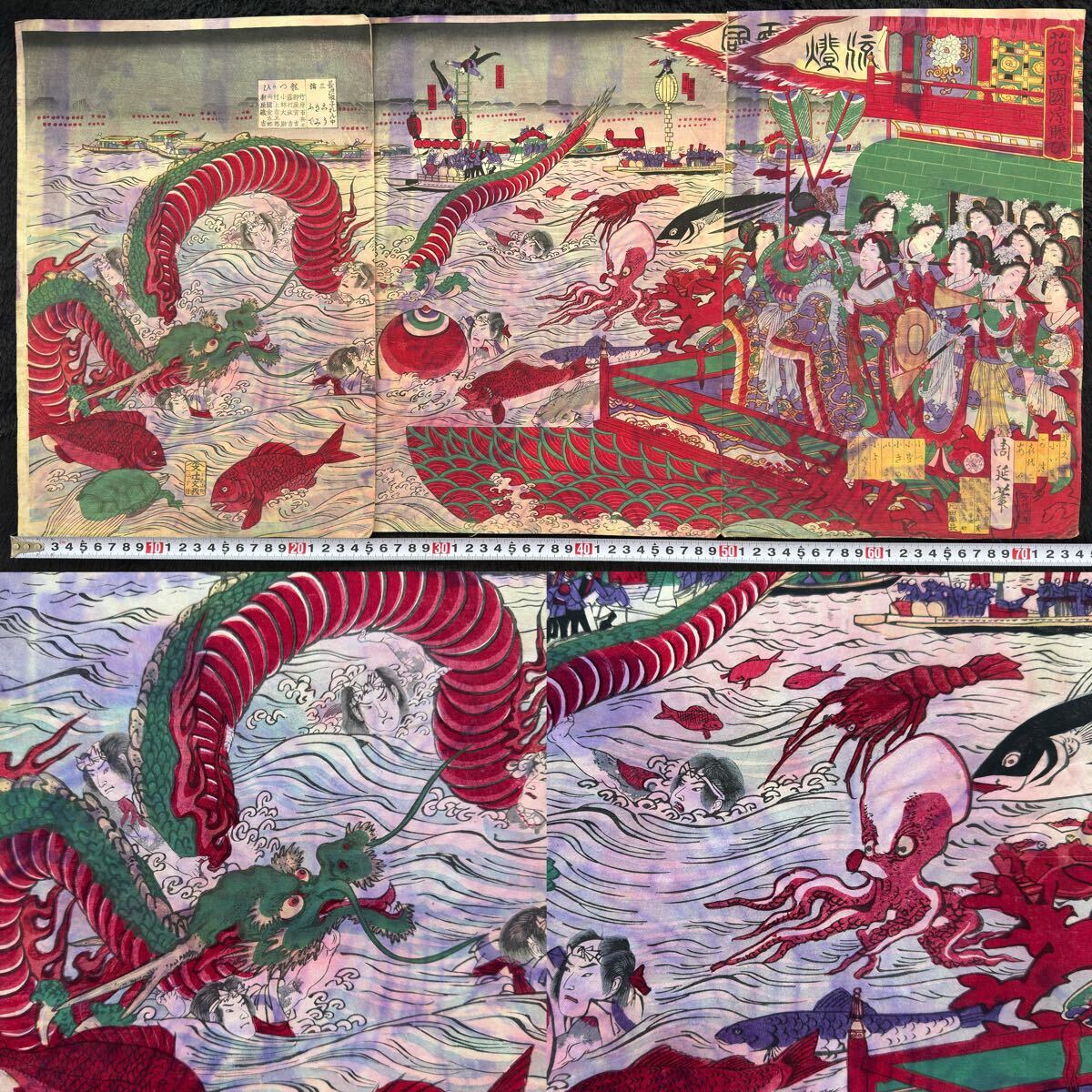 - 龍!蛸!明治期/真作 楊洲周延「花の両国涼賑ひ」本物浮世絵木版画 美人画 錦絵 大判 三枚続き