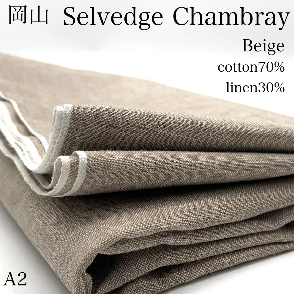 - A2 岡山 綿麻セルビッジシャンブレー 5m ベージュ 綿70% 麻30% コットンリネン 無地 生地 日本製 国産 岡山県産 はぎれ