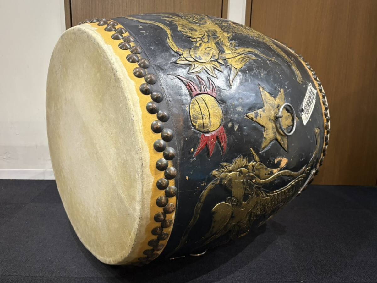 > NJZB7-121-2 □ 直接引取限定 和太鼓 長胴太鼓 宮太鼓 大太鼓 太鼓 龍彫り 耳なし 打楽器 和楽器 楽器 胴高 約70cm 鼓面 約60cm 中古