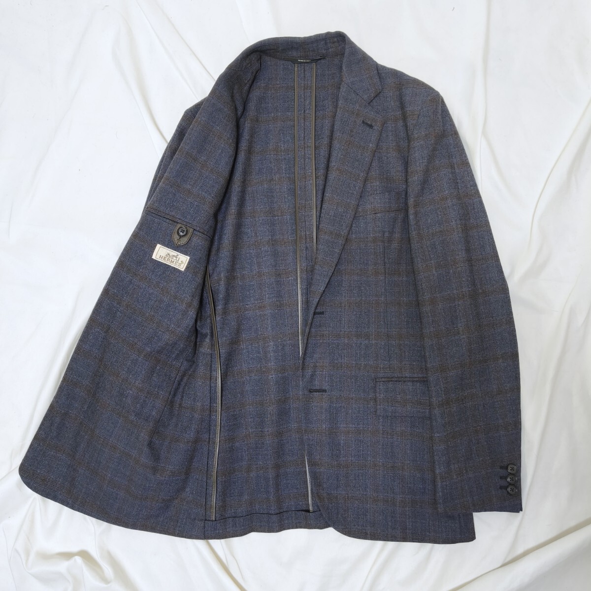 > 極美品◯HERMES エルメス ウール使用 チェック柄 2ボタン テーラードジャケット ネイビー 〜SIZE44 S相当〜