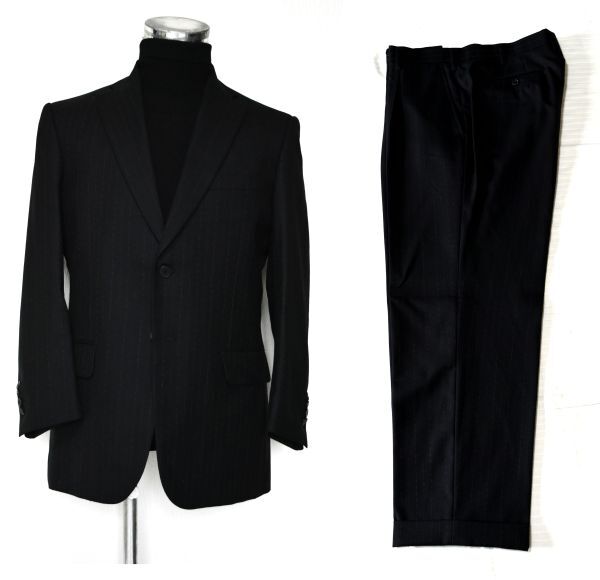 - 200★GIANNI VERSACE★イタリア★ヴェルサーチ★黒に臙脂系幅広ストライプ 羽織るだけでオーラある男を演出着心地良いシングルスーツL-50