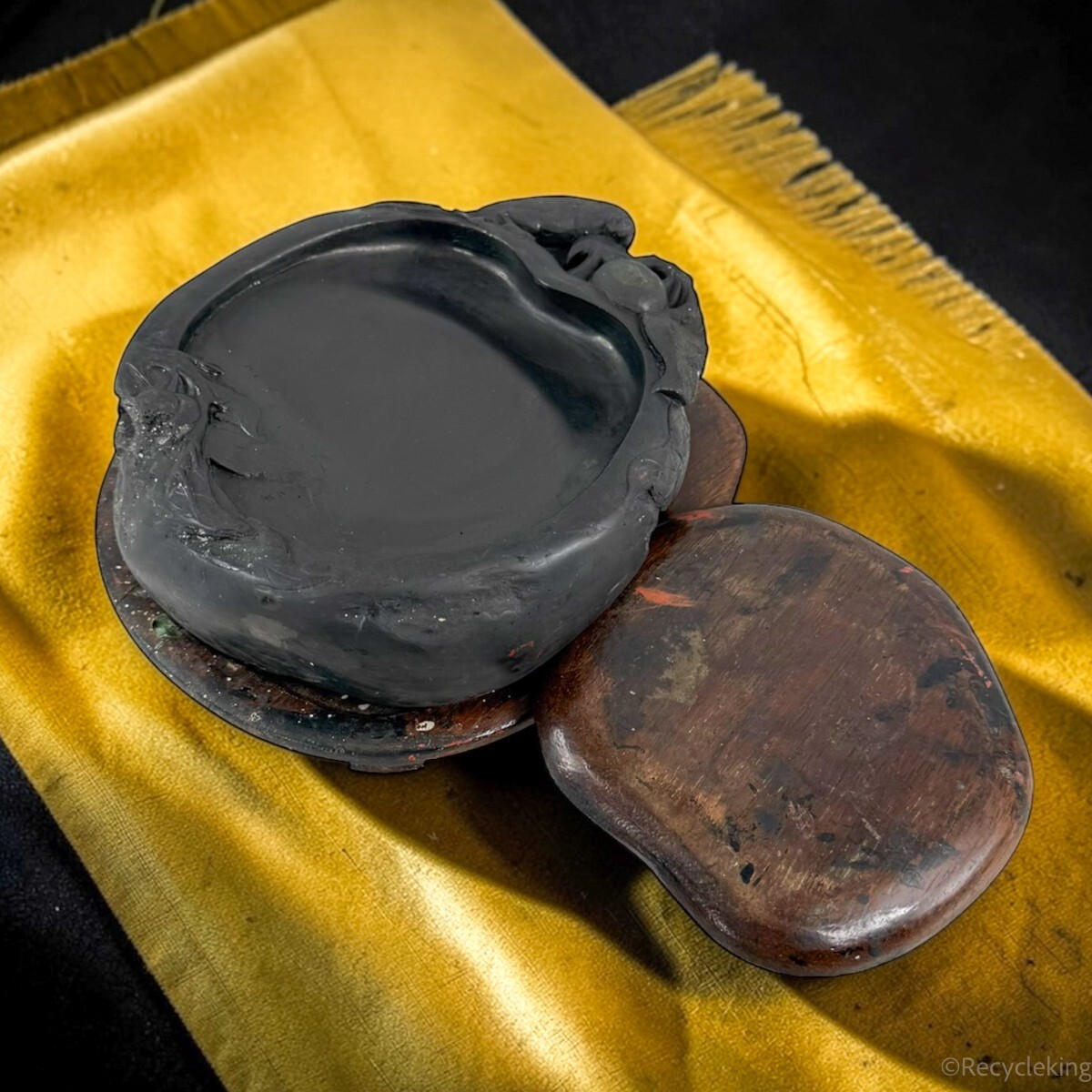 - 中国 端渓 翡翠斑 石紋 鳥刻硯 唐木蓋台座付 古硯 唐硯 書家収蔵品 文房四宝 書道具 すずり 20260315-33