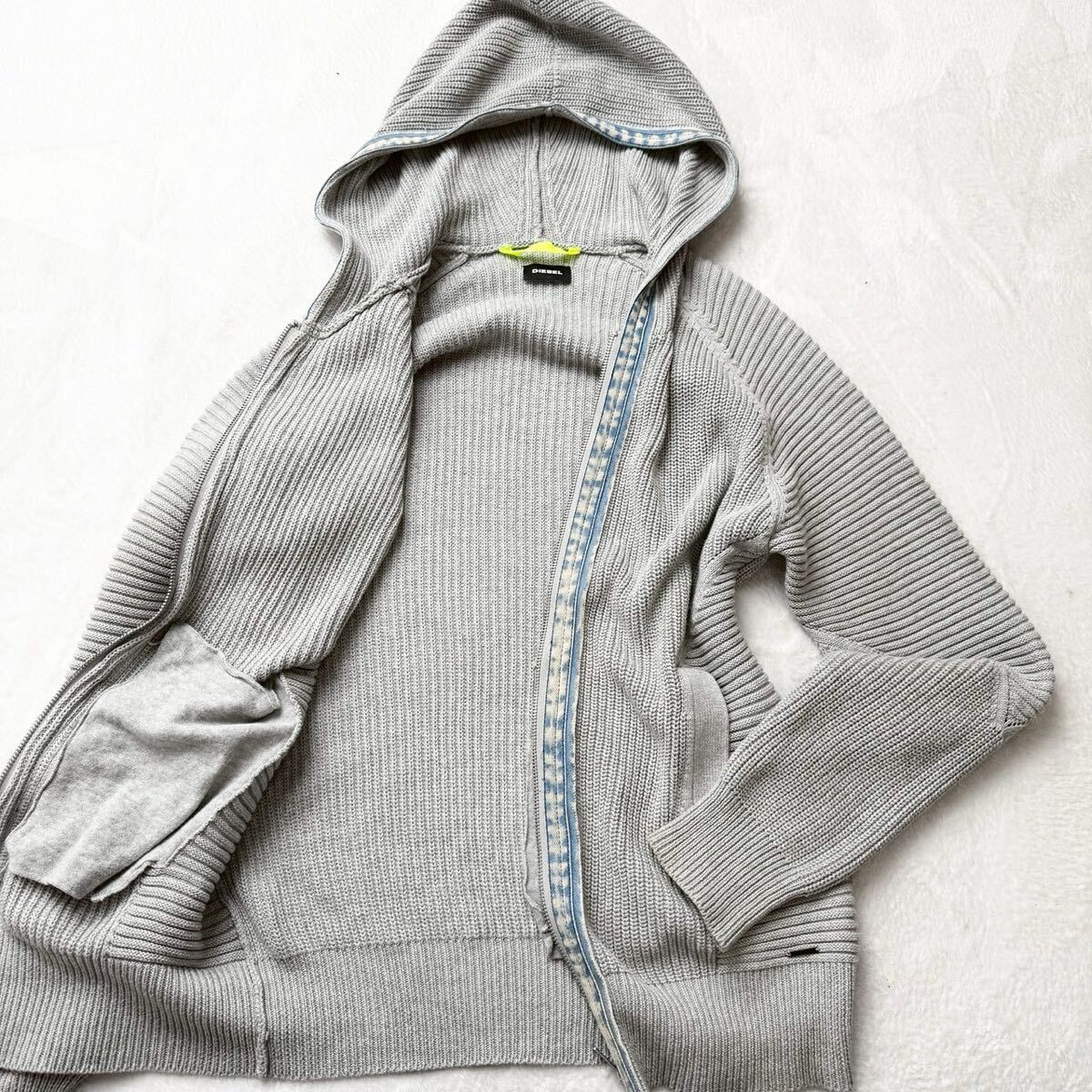 > 2754 希少Lサイズ DIESEL ディーゼル パーカー ジップアップ ニット デニム切替 ブルゾン ジャケット ロゴプレート インディゴ グレー