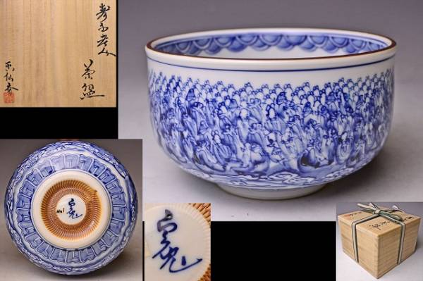 > 木村勝明 ( 画仙斎白兎 ) ★ 染付千寿老人茶碗 ★ 共箱 ★ 飛び鉋高台 !