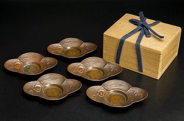 - 明治時代 蝙蝠霊芝太極紋銅茶托 5客 煎茶道具 古美術
