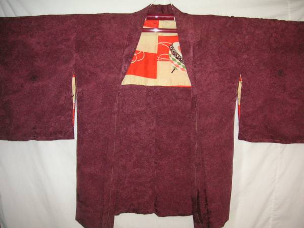 - 羽織 臙脂色 正絹 地模様 梅の紋 新古品