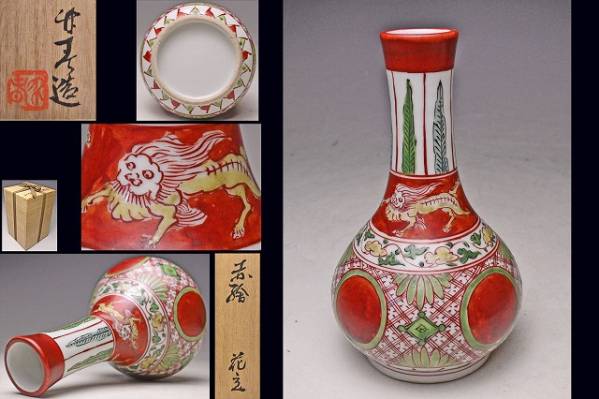 - 川瀬竹春 初代 ★ 色絵赤玉獅子文花瓶 ★ 共箱 ★ 川瀬竹翁 ★ 検 川瀬忍