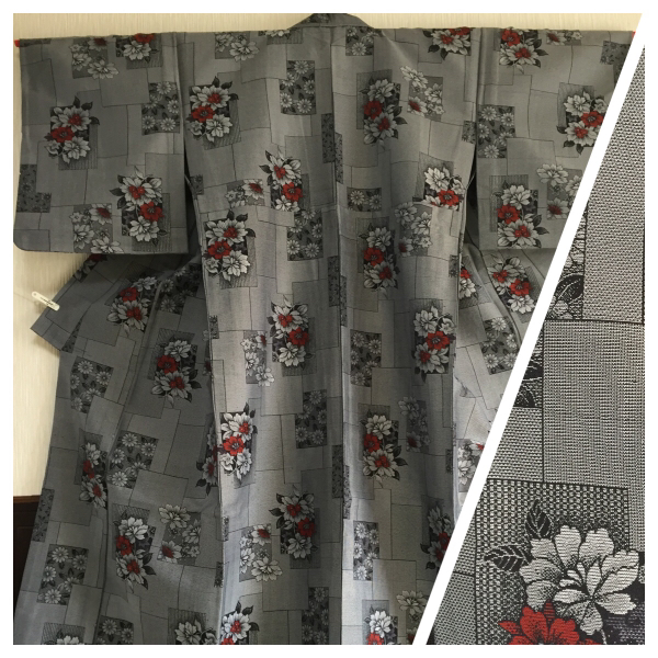 - 【ウールアンサンブル】単衣 着丈144cm 上っ張り 花柄 鼠色
