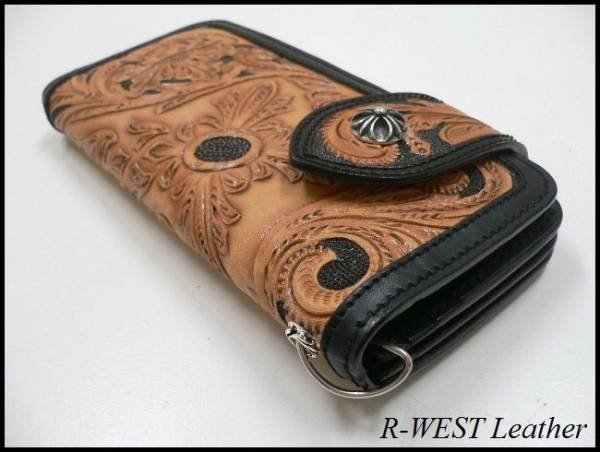 - 牛革カービング花柄 レザーウォレット 黒×ヌメ/革財布ALL20%OFF