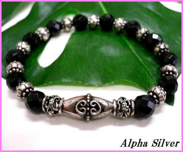 - シルバー925銀パーツ天然石カット オニキス8mm数珠ブレス/ラスト1点