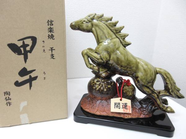 - 極美品■信楽焼 陶仙作 干支 甲午 午 馬 うま 飾り 置物 箱入り 台付 管理1703 B-3
