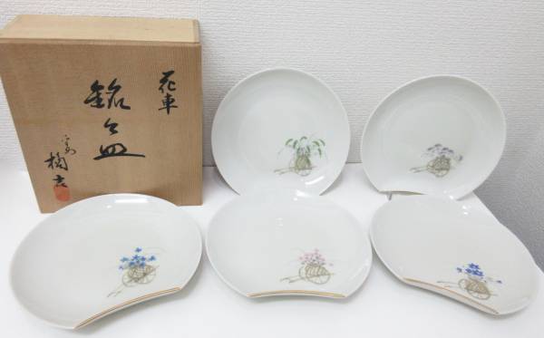 - 未使用品■平安 たち吉 花車 銘々皿 取り皿 和皿 扇型5客揃 木箱 管理1705 E-9