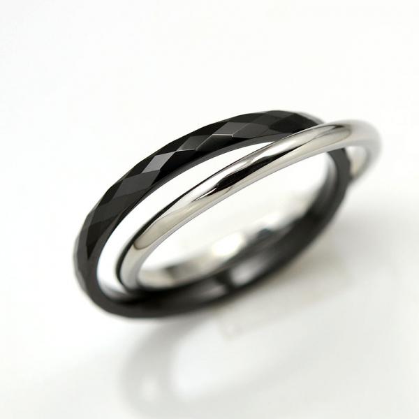 > ★人気★変色無★手入れ不要★肌に優しい★金属アレルギー&温泉&海水浴OK★甲丸ダイヤカットブラックタングステン&ステンレス2連リング★