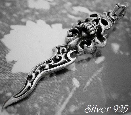 - シルバー925銀の髑髏スカル ヘッド トライバル ソード ペンダント/S&A silver
