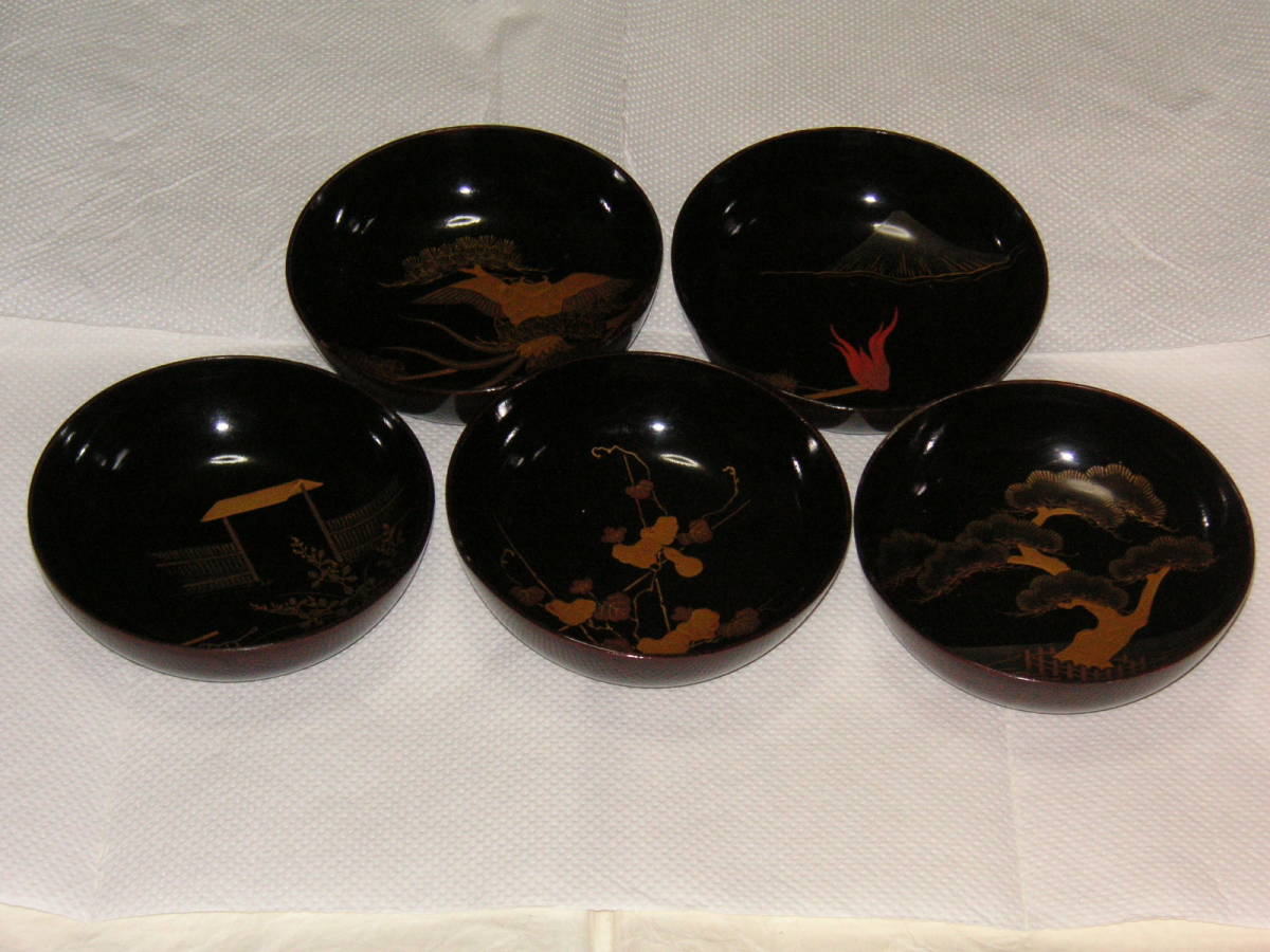 - 漆器 木皿 本金 輪島塗 絵替り 5客 ①