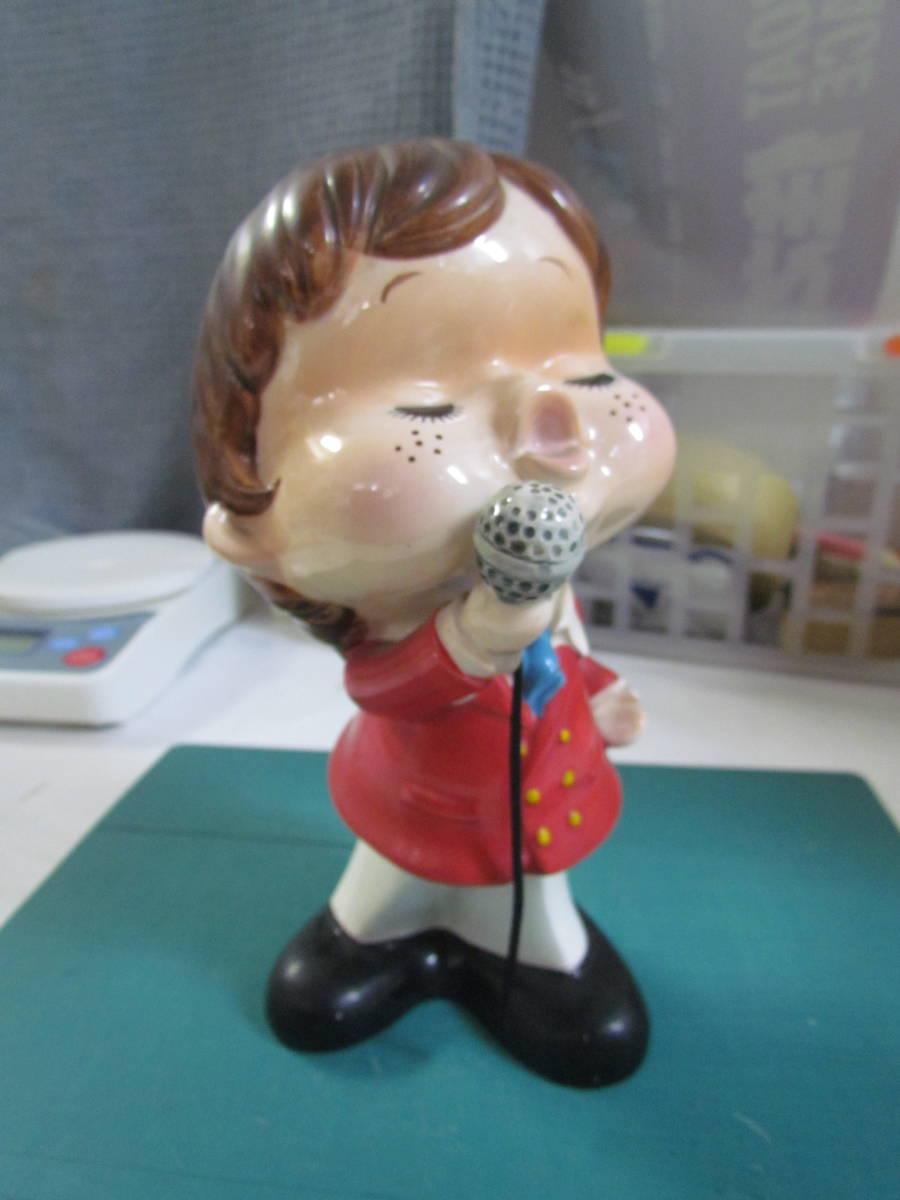 - 【昭和レトロ】陶器の貯金箱 歌う男の子 モンアミ?(底にMONと印があります) 高さ約21cm 底のゴム無し ジャンク