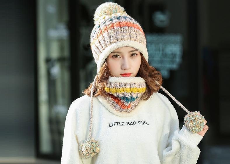 - 【新品】 ベージュ ポンポン付き ニット帽 レディース 帽子 スヌード 裏ボア セットアップ キャップ 裏起毛 スキー スノボ スキーウエア