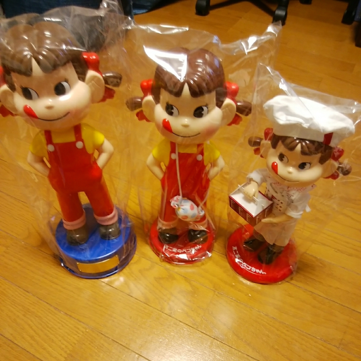 - 即決! ペコちゃん ダイソー キャンディーポーチ付 ペコちゃん人形&首振りペコちゃん(青台座)&ユニフォームペコちゃん