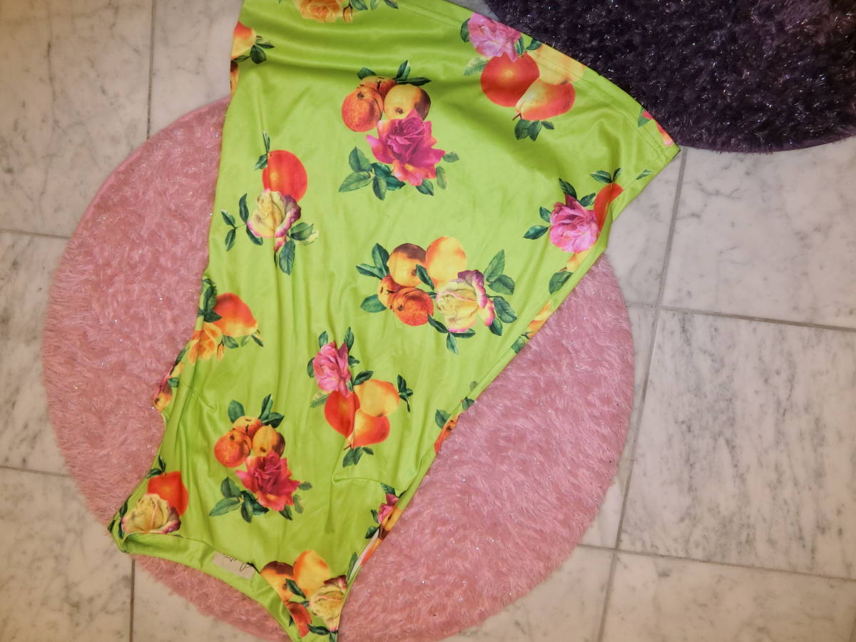 - インポート 花柄 フルーツ柄 サマーワンピース リゾートワンピース Mサイズ 黄緑系