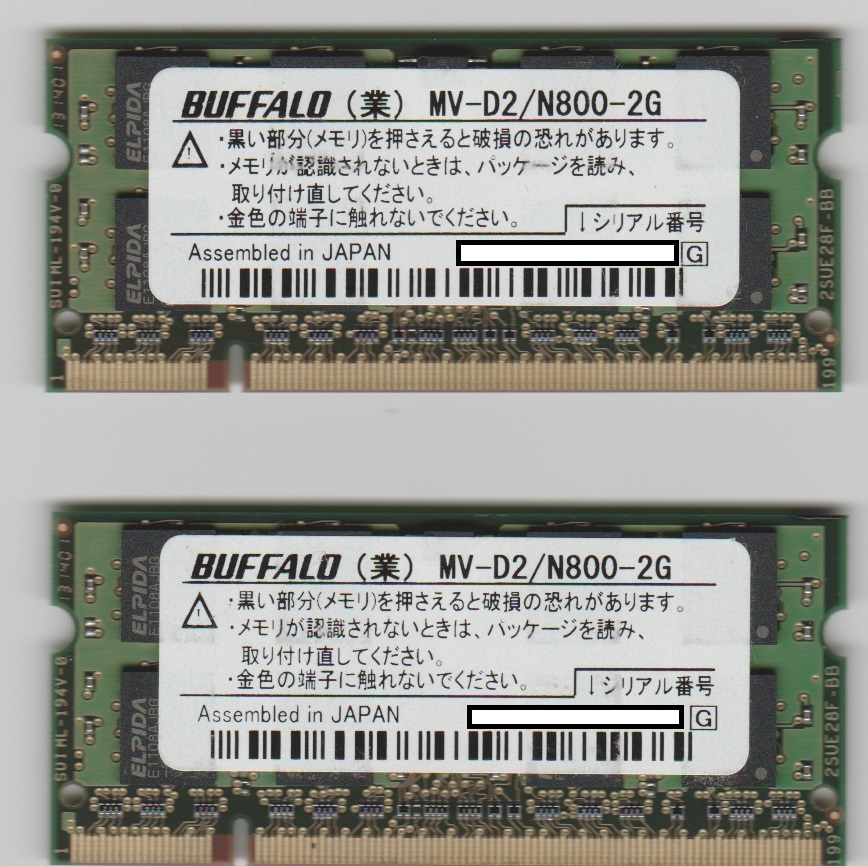 - バッファロー(BUFFALO)メモリー D2/N800-2G 2枚組 (同一製造ロット2枚組)合計4GB PC2-6400 200Pin 即決 相性保証