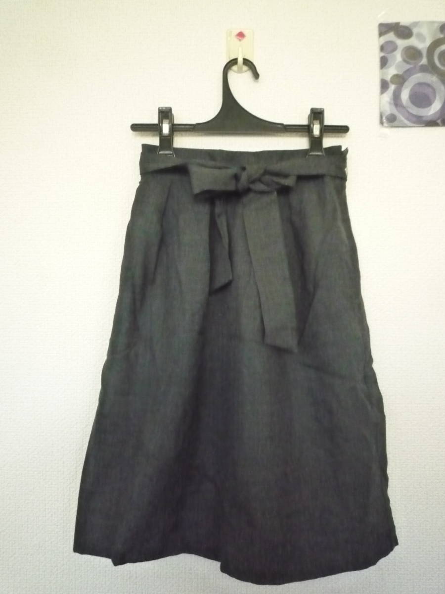 > ★ユニクロ 膝丈フレアスカート ウエストリボン チャコールグレー毛100% ウエスト(58㎝)