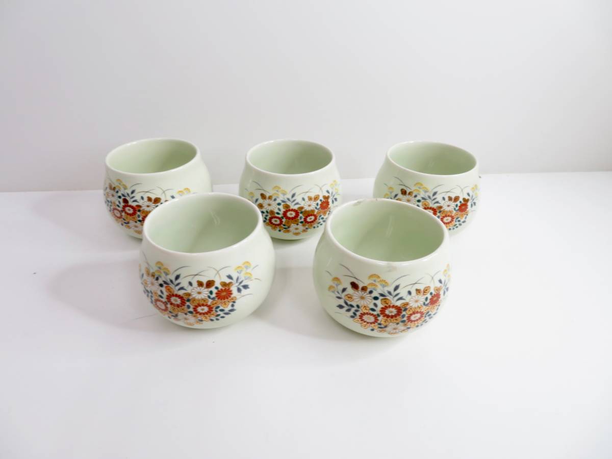 > ◆九谷焼 菊柄 湯呑み 5客セット 湯呑茶碗 花柄 黄緑 茶器 和食器 食器 伝統 工芸 陶器 美品 管理2004 F-11