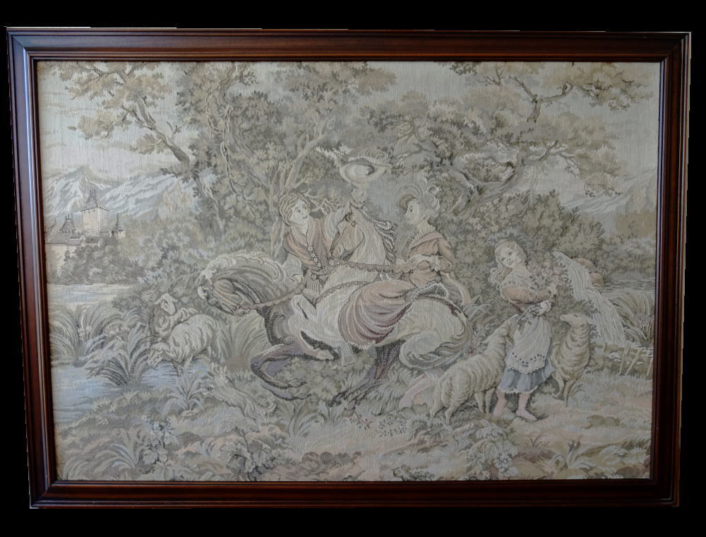- ■□イタリア製 高級 ゴブラン織り タペストリー 人物 風景 アンティーク 額入り 大判 ロココ 壁掛け □■