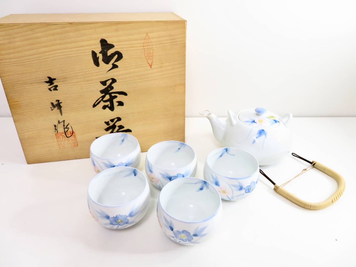 > 未使用品▲有田焼 吉峰作 茶器揃 湯呑みセット 湯飲み 5客セット 急須 花 銘あり 木箱入 管理2008 X-1