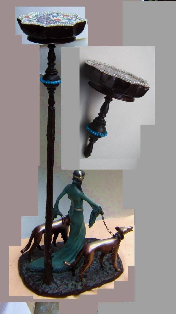 - 27.ブロンズ像 Prof o Poerzl作 散歩する女性 犬 彫刻 電話台 植木鉢、小物台