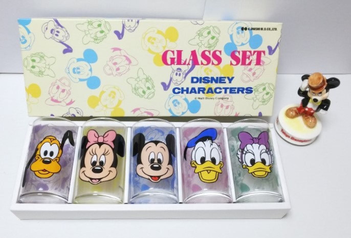 > Disney ①90s ヴィンテージ 日本製 未使用品 キャラクター グラスセット+②おまけ USED品 ミッキーオルゴール※オフィシャル(ライセンス)