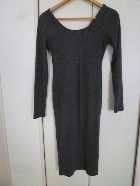 - ROYAL PARTY/ローヤルパーティー○グレー縦リブ背中ジップアップスリット入りボディコンワンピースF/長袖ミモレ丈ロング○OP1119