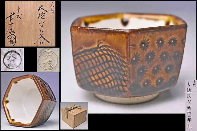 > 大樋長左衛門 10代 ★ 六角 大樋 ぐい呑 ★ 共箱 共布 栞 ★ 大樋年朗 ★ 酒器 ★ 飴釉 印華 網目文 ★