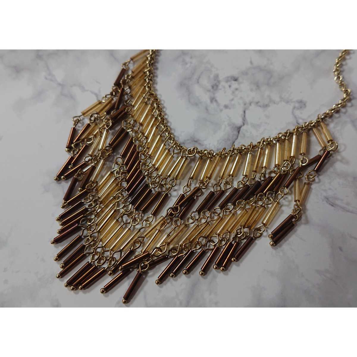 - □存在感&オリエンタル□ゴールドカラー&ブラウンビーズのフリンジネックレス□パーティーにも□