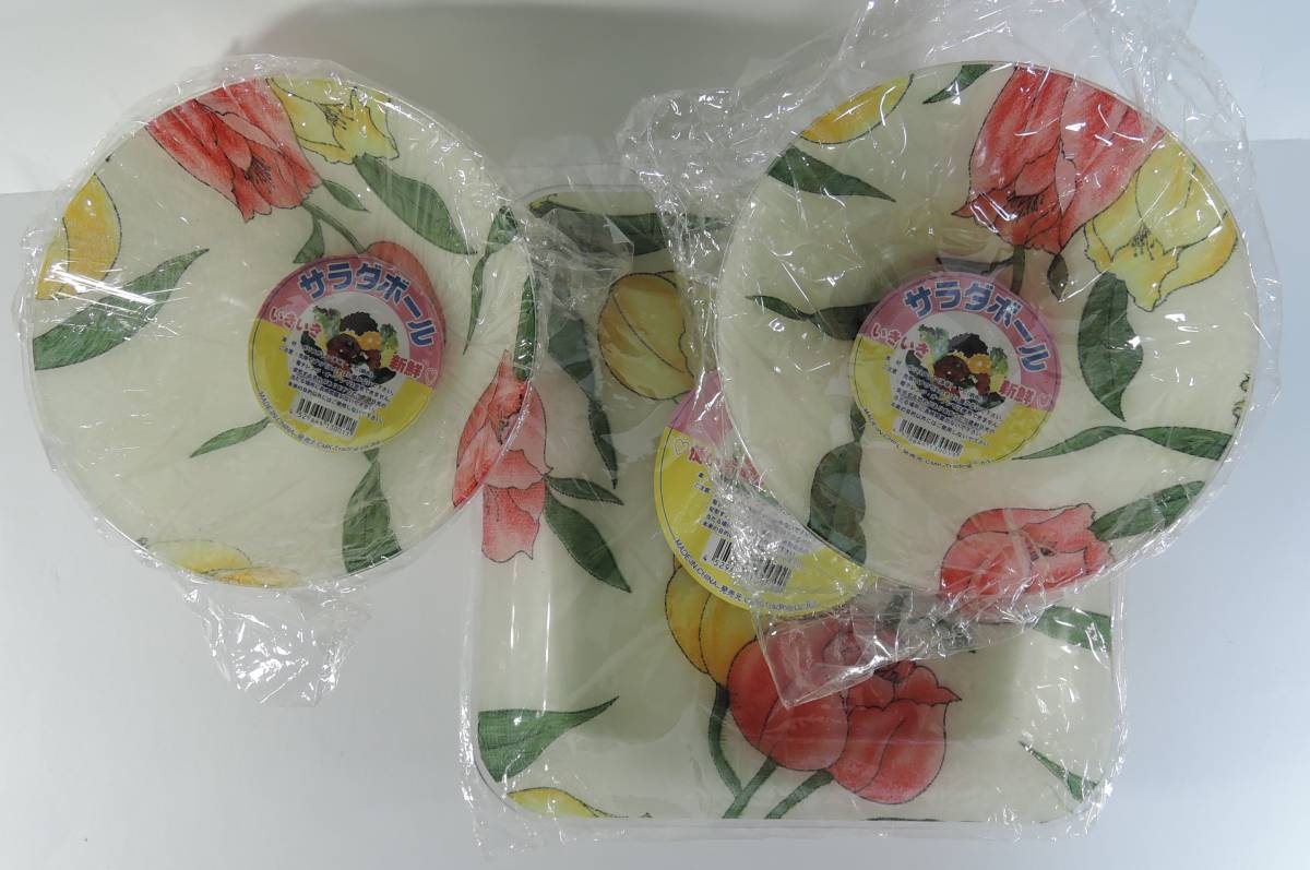- ☆Y08 昭和レトロ■柄布入り ポリスチレン サラダボール2個&プレート(角型)■未使用