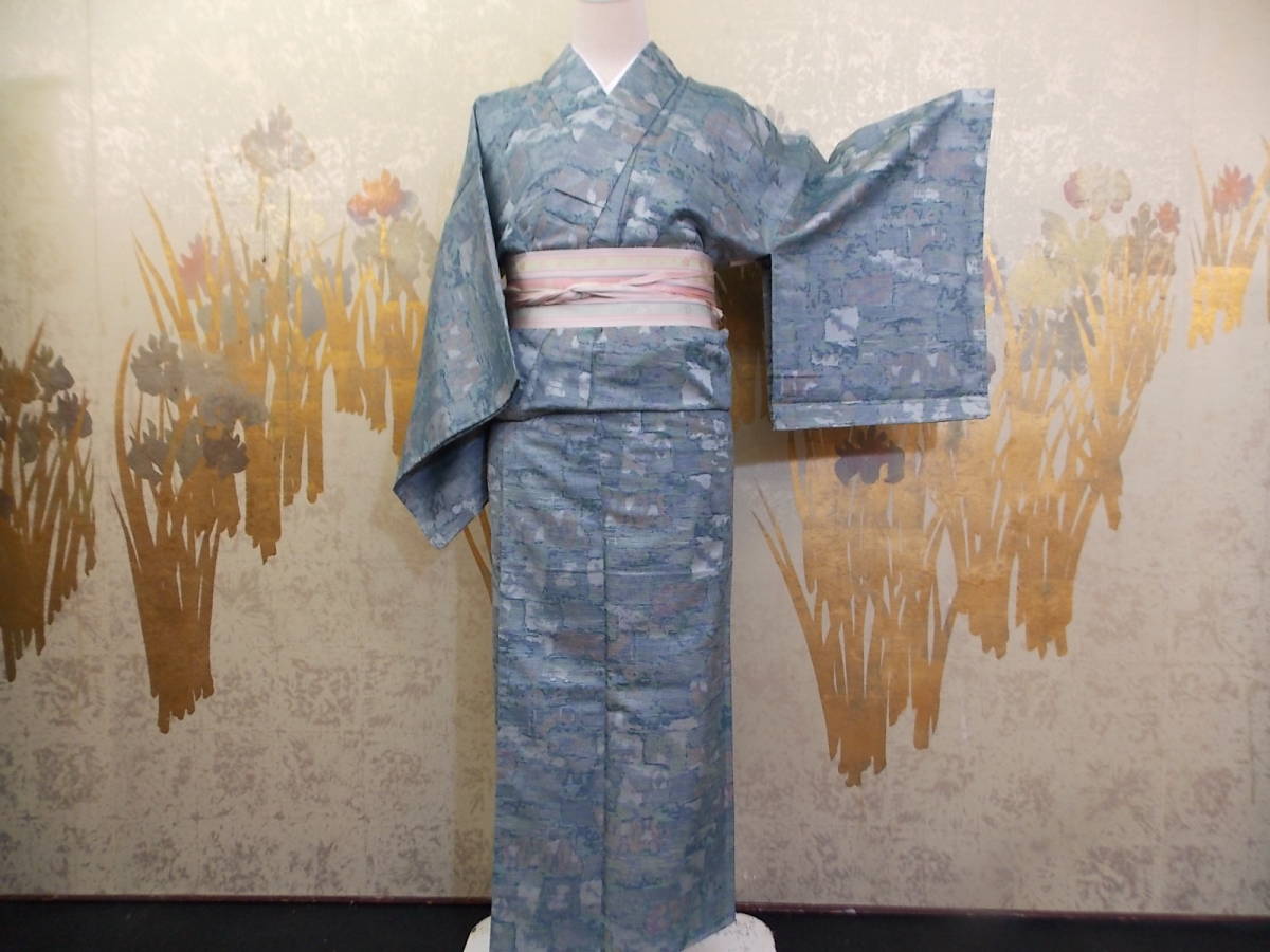 > きもの今昔2346 ウールきもの シルクの入ったお召ウール 水色系主体地色で生地に光沢があります 躾け付き未使用品