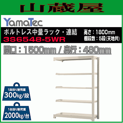> 山金工業 ボルトレス中量ラック連結 3S6548-5WR 高さ180cm 間口150cm 奥行48cm 5段/白 連結用ラック スチール製棚 YamaTec[送料無料]