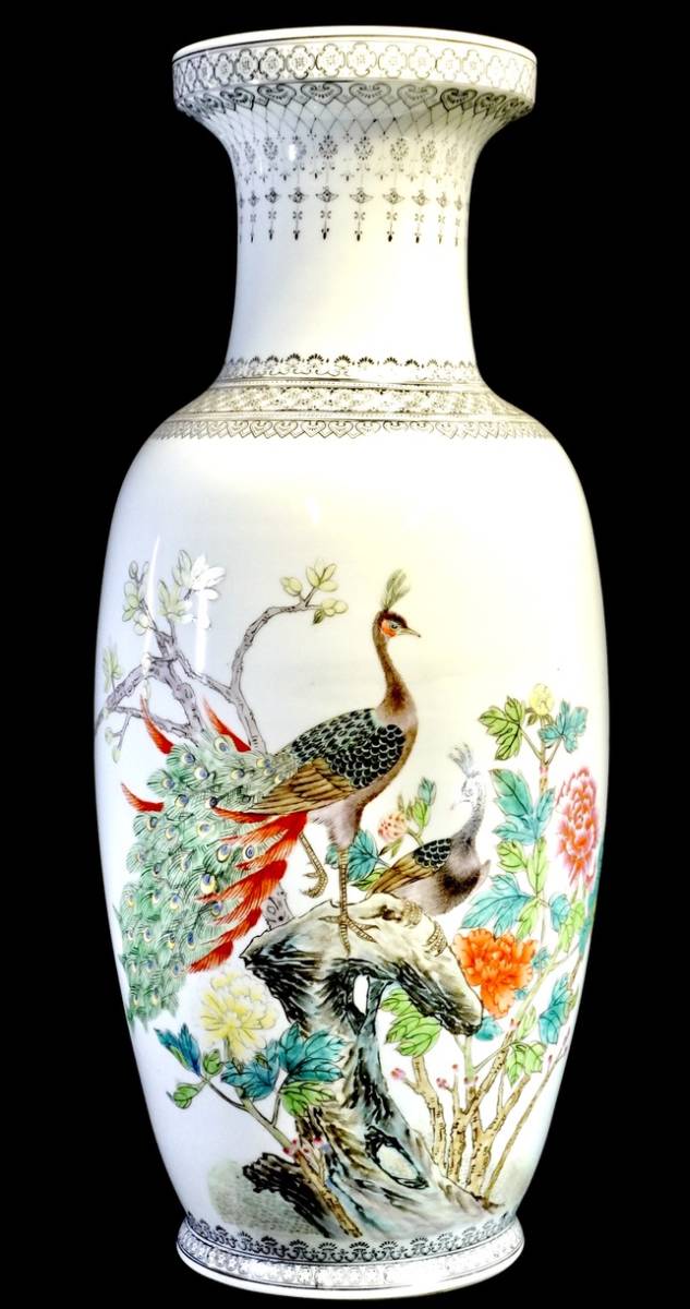 - 中国古玩 中国古美術 景徳鎮 唐物 色絵粉彩細密花孔雀漢詩紋大花瓶 高さ61cm! 細密な花鳥図が素晴らしい逸品! エステートセール KNA