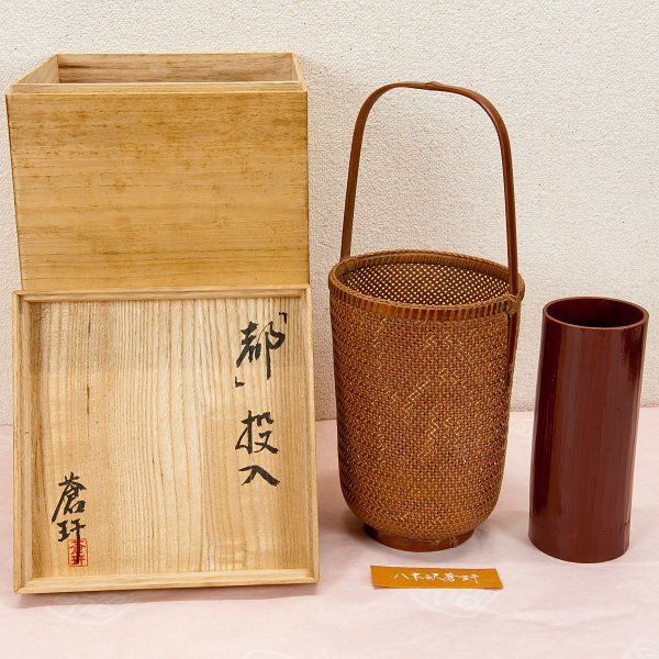 > 八木沢蒼 「都」 投入 共箱 オトシ付 刻銘 「蒼」 【2m84】 花入 花籠 竹工芸 竹編 篭 長期保管品 置物 骨董 レトロ アンティーク