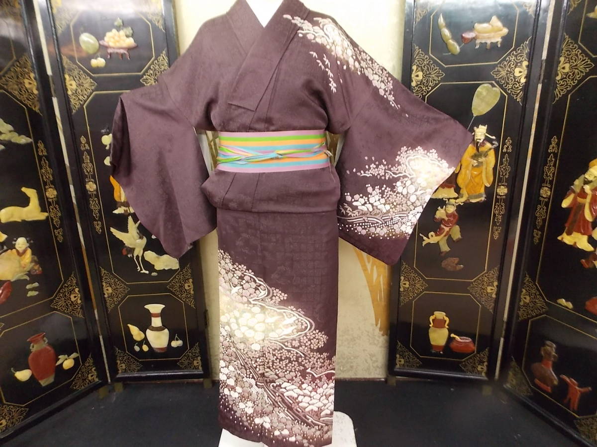 > きもの今昔2766 訪問着 チャコールグレー色にラメ糸の入った生地 辻が花風のタッチで優しく多彩に花の柄 極上品