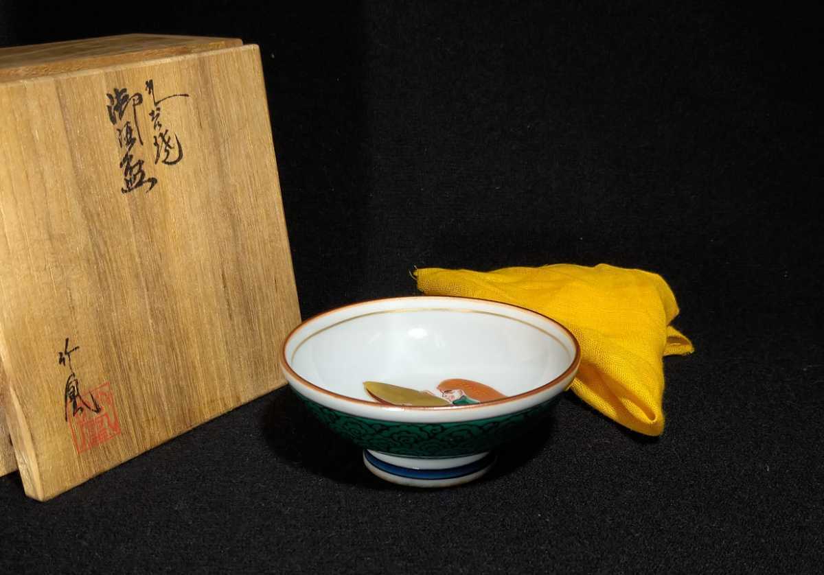 - 山上竹凰 「九谷焼御酒盃」 金彩 色絵 人物と酒盃図 酒盃 共箱 黄布 酒器 九谷焼 a-32i1424