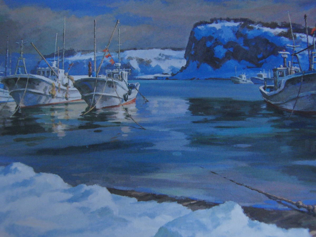 - 根岸富夫、〈北の漁港〉、希少画集画、高級新品額・額装付、状態良好、送料無料